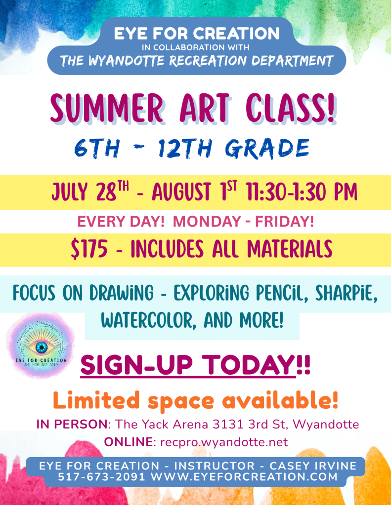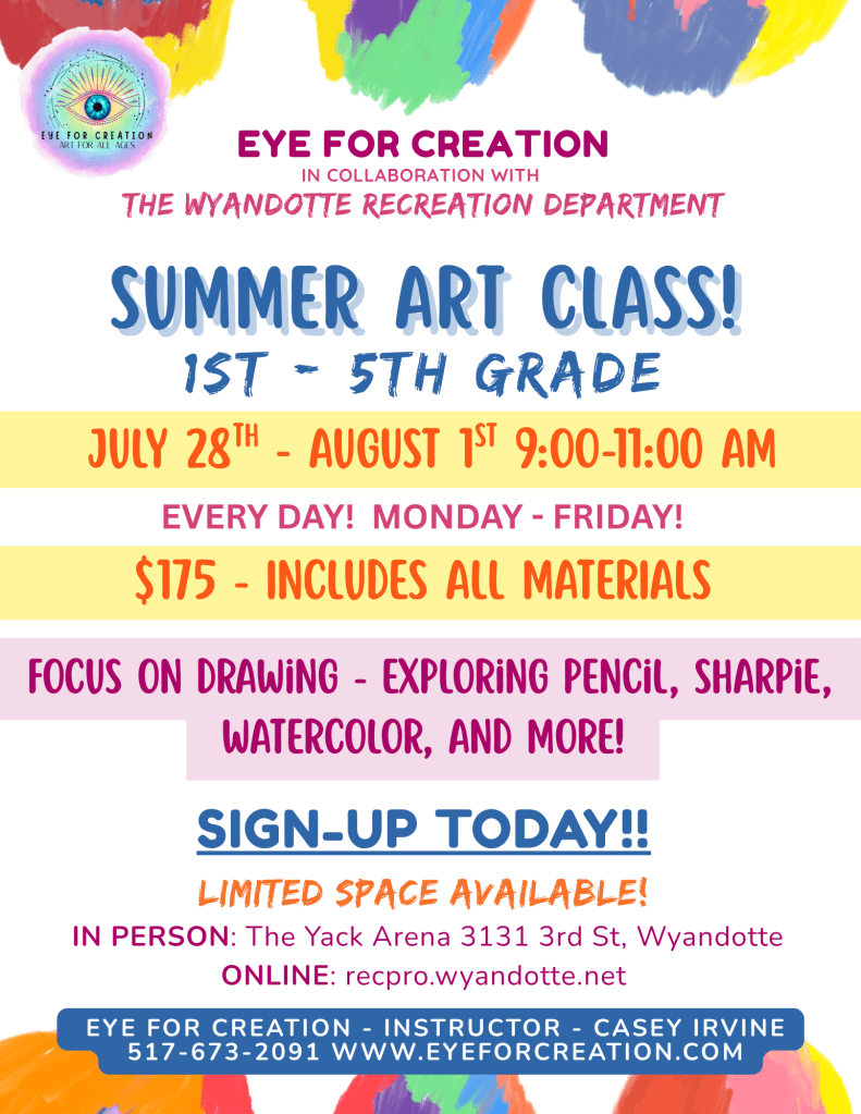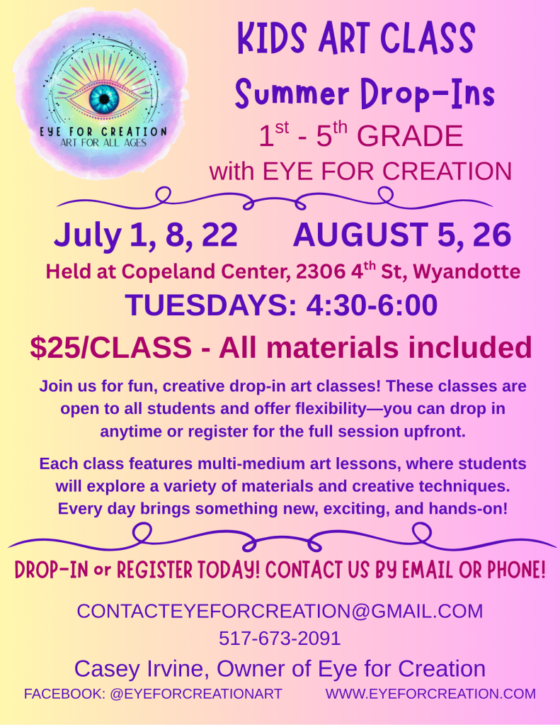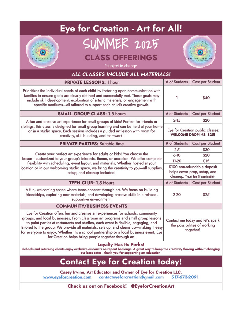 Eye for Creation is a mobile, community-centered art education business founded and led by certified Michigan art educator Casey Irvine. With over 17 years of experience in K–12 education, special education, and community arts programming, Eye for Creation provides high-quality, inclusive art experiences for learners of all ages.