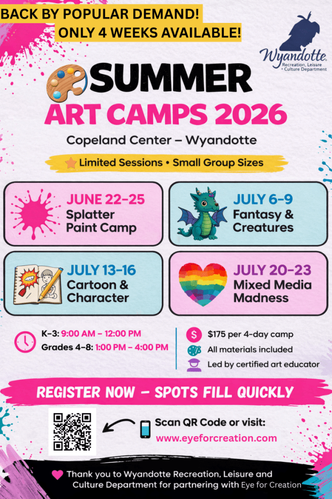Eye for Creation Summer Art Camps offer a fun, creative, and engaging experience for young artists in the Wyandotte community. In partnership with the Wyandotte Recreation Department, these camps are designed to inspire creativity, build confidence, and encourage artistic exploration in a supportive environment.